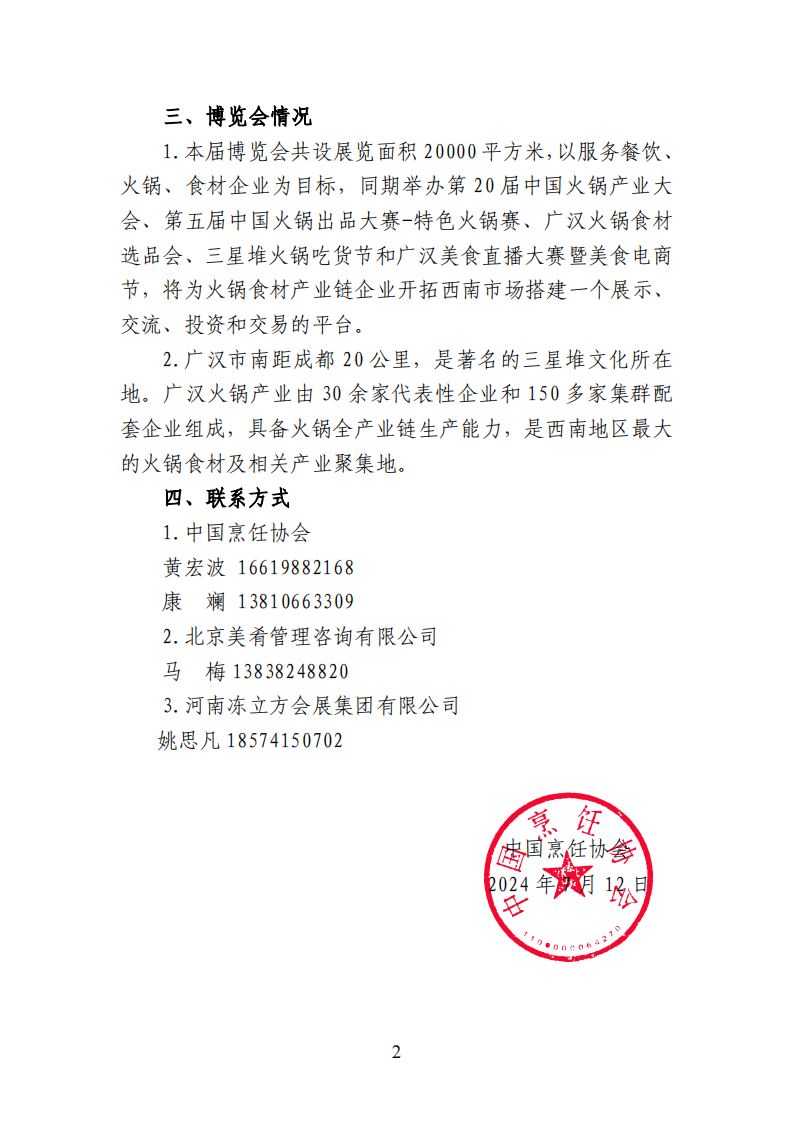主辦單位:中國烹飪協會 北京美肴管理咨詢有限公司 承辦單位:中國烹飪協會預制菜專業委員會 中國烹飪協會火鍋專業委員會 德陽高博會展有限公司 執行單位:河南凍立方會展集團有限公司